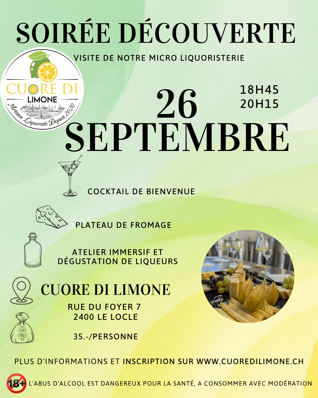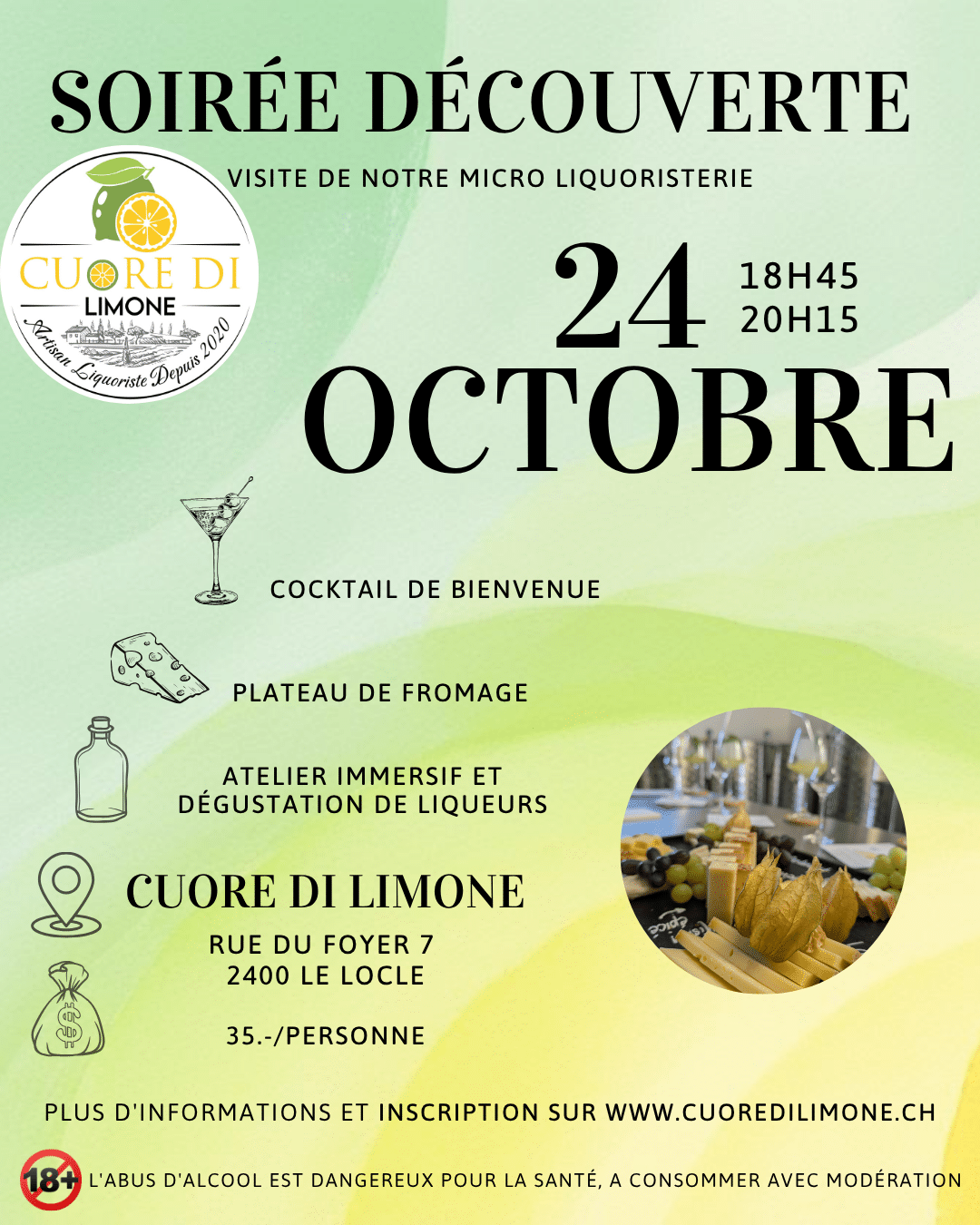 Cette date est complète  Soirée Découverte  Participez à une présentation de nos liqueurs artisanales par Nastasia dans notre local de fabrication. Découvrez leur processus de fabrication et dégustez nos créations dans un cadre professionnel accompagné d'une sélection de fromage des fromager des chaux. Au programme de cette soirée exclusive : Cocktail de bienvenue :Un premier […]